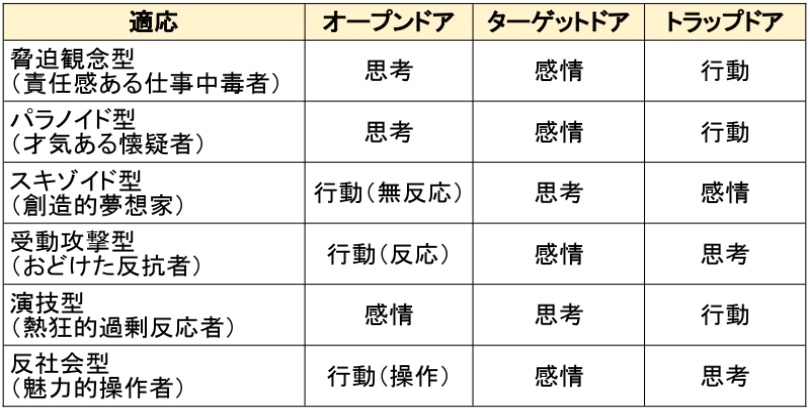 相手の人格適応によって、どのドアにどの領域でコンタクトを取ればうまくいく、という対応があります。以下に、人格適応ごとの各ドアに対応する領域を示します。